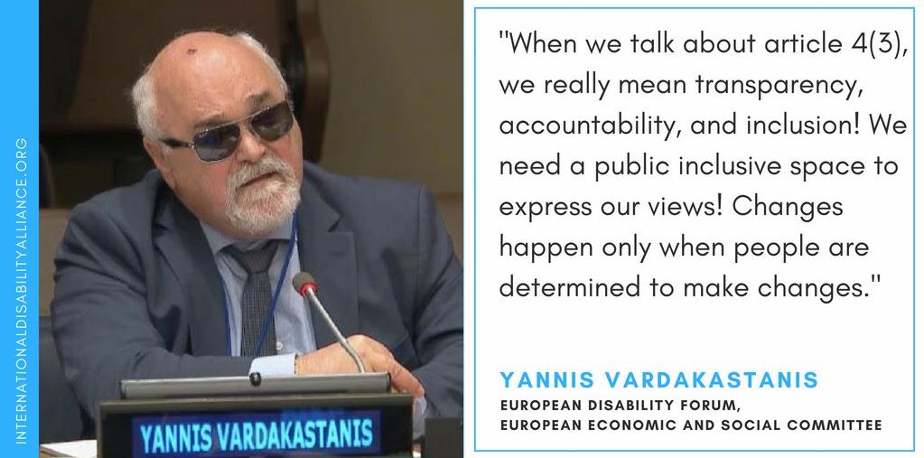 Ο κ. Βαρδακαστάνης μίλησε στην παράλληλη εκδήλωση που διοργάνωσε η Επιτροπή για την Σύμβαση "Για την ουσιαστική Συμμετοχή", εκπροσωπώντας την Παγκόσμια Οργάνωση Αναπηρίας (IDA), καθώς και το EDF και την ΕΟΚΕ: " Πρέπει να είμαστε εκεί όπου είναι οι κοινωνικοί εταίροι, όπου είναι οι οργανώσεις των γυναικών, όπου είναι οι εκπρόσωποι της κοινωνίας των πολιτών.. Δεν χρειάζεται να ανακαλύψουμε ξανά την Αμερική, έχει ήδη ανακαλυφθεί. Πρέπει να επιστρέψουμε στα βασικά και στα θεμέλια της Σύμβασης. Πρώτα χρειαζόμαστε νομική αναγνώριση - αλλά η ενεργός συμμετοχή μπορεί να συμβεί μόνο σε συγκεκριμένο πλαίσιο. Χρειαζόμαστε προσβάσιμα περιβάλλοντα και εύλογες προσαρμογές, χρειαζόμαστε την υποστήριξη, την κατάρτιση των ηγετών, των δημοσίων υπαλλήλων, σε αυτά πρέπει να επενδύσουμε. Εάν τα κράτη μέρη λαμβάνουν αποφάσεις χωρίς τις οργανώσεις των ατόμων με αναπηρία, θα πρέπει να υπάρχουν συνέπειες και οι αποφάσεις τους να ακυρώνονται. Πρέπει να διασφαλίσουμε ότι τα άτομα με αναπηρία είναι στο τραπέζι, δεν είναι αρκετό να είναι στην πόρτα! Χρειαζόμαστε ένα ισχυρό κίνημα αναπηρίας παντού και σε όλα τα επίπεδα"!