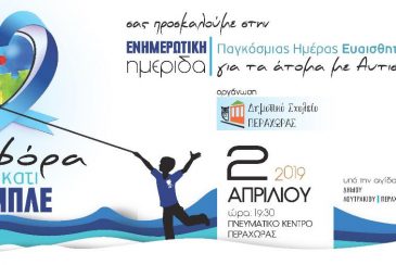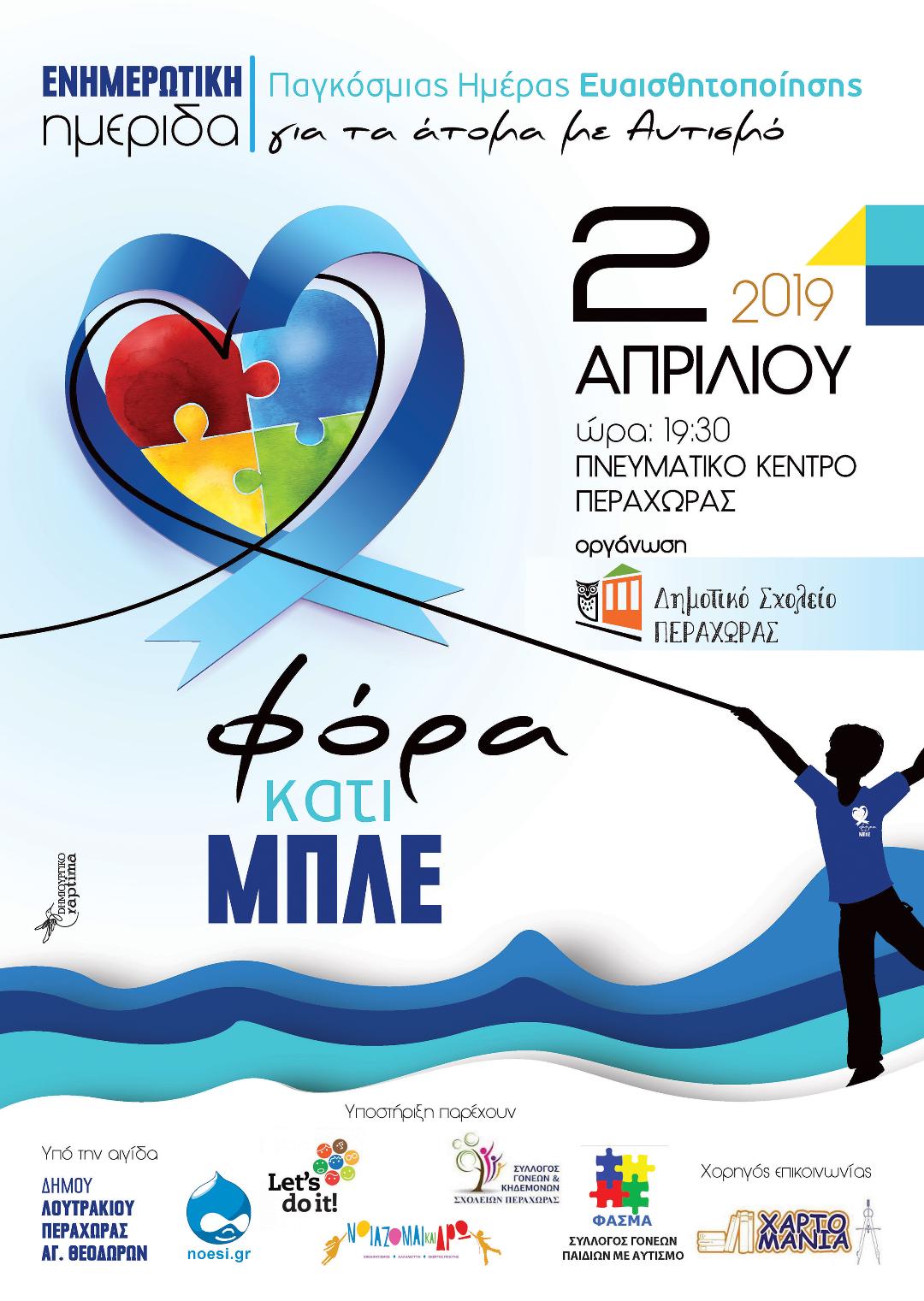 Το Τμήμα Ένταξης του Δημοτικού Σχολείου Περαχώρας διοργανώνει την Τρίτη 2 Απριλίου 2019 Ενημερωτική Ημερίδα με αφορμή την Παγκόσμια Ημέρα Ευαισθητοποίησης για τα άτομα με Αυτισμό και με το σύνθημα «Φόρα κάτι μπλε», στο Πνευματικό Κέντρο Περαχώρας στις 19:30.